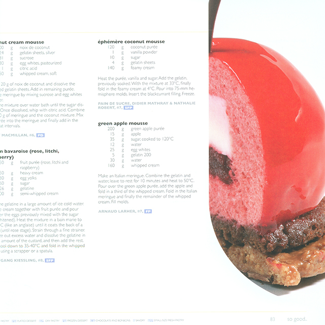 また各レシピが皿盛りデザートなのか、ガトーなのか、プチガトーなのか、チョコレートなのか分かるようマークが記してあり分かりやすい。